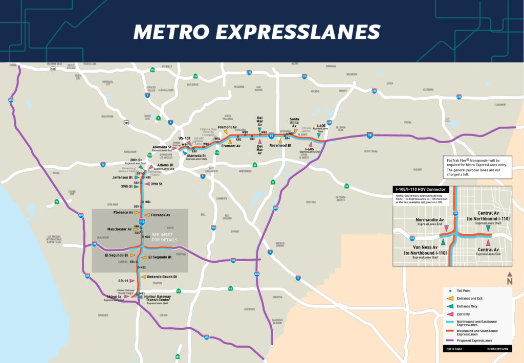 Now it’s time to engage in every Californians favorite pass time, talking about roads that connect to other roads. If someone is heading South on the 110 to travel from Pasadena, East Los Angeles, or Downtown Los Angeles they can enter FasTrak lanes just south of Downtown. Those two left lanes then travel in several elevated sections above the rest of the 110 traffic without any flyovers, and only a couple spots where the elevation changes to allow for merging in or out. When the 110 meets the 105 the FasTrak lane splits in two, with one lane for the 105 heading toward LAX, and the other continuing to other overpasses to go East to Norwalk, or continue South towards San Pedro.