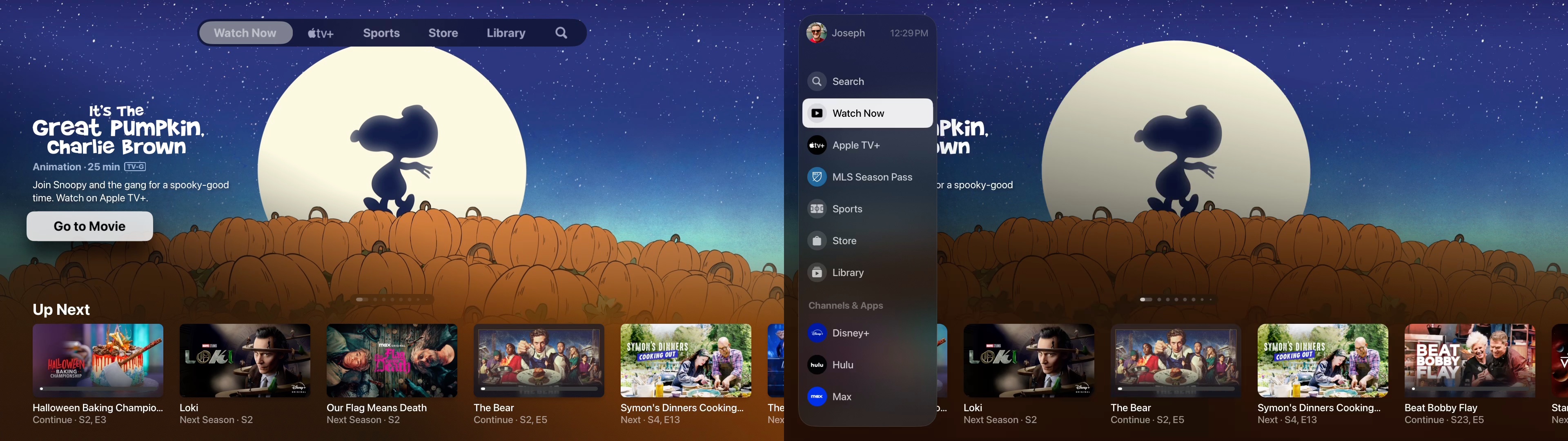 After being accosted by Apple TV+, you can get to the side bar either by tapping the “<” or “Menu” button, or by swiping all the way to the left. The bar shows the current user profile, but it can’t be changed there, that needs to be done in Control Center.