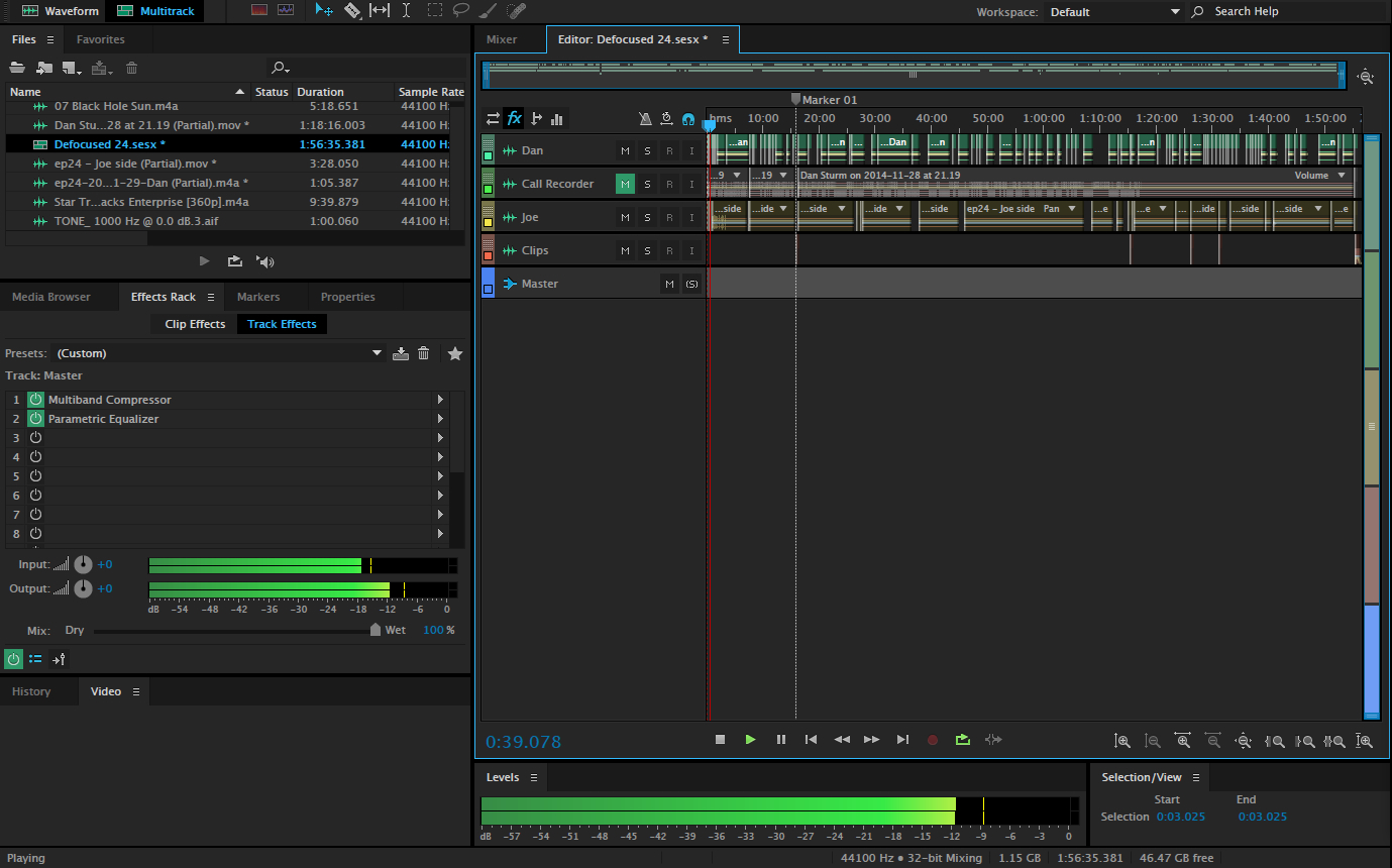 The two times I’ve edited the podcast, for Galaxy Quest and Interstellar, I went with Adobe Audition CC 2014 (just rolls of the tongue). I had an existing relationship with Adobe that made this tool appealing to use. Almost every podcaster uses Logic Pro to do their work, so please don’t place a purchasing decision on me editing two episodes in something that was convenient for me.